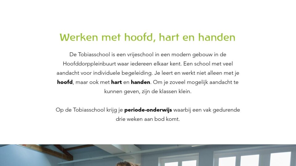 De Tobiasschool is een vrijeschool in een modern gebouw in de Hoofddorppleinbuurt waar iedereen elkaar kent. Een school met veel aandacht voor individuele begeleiding. Je leert en werkt niet alleen met je hoofd, maar ook met hart en handen. Om je zoveel mogelijk aandacht te kunnen geven, zijn de klassen klein.